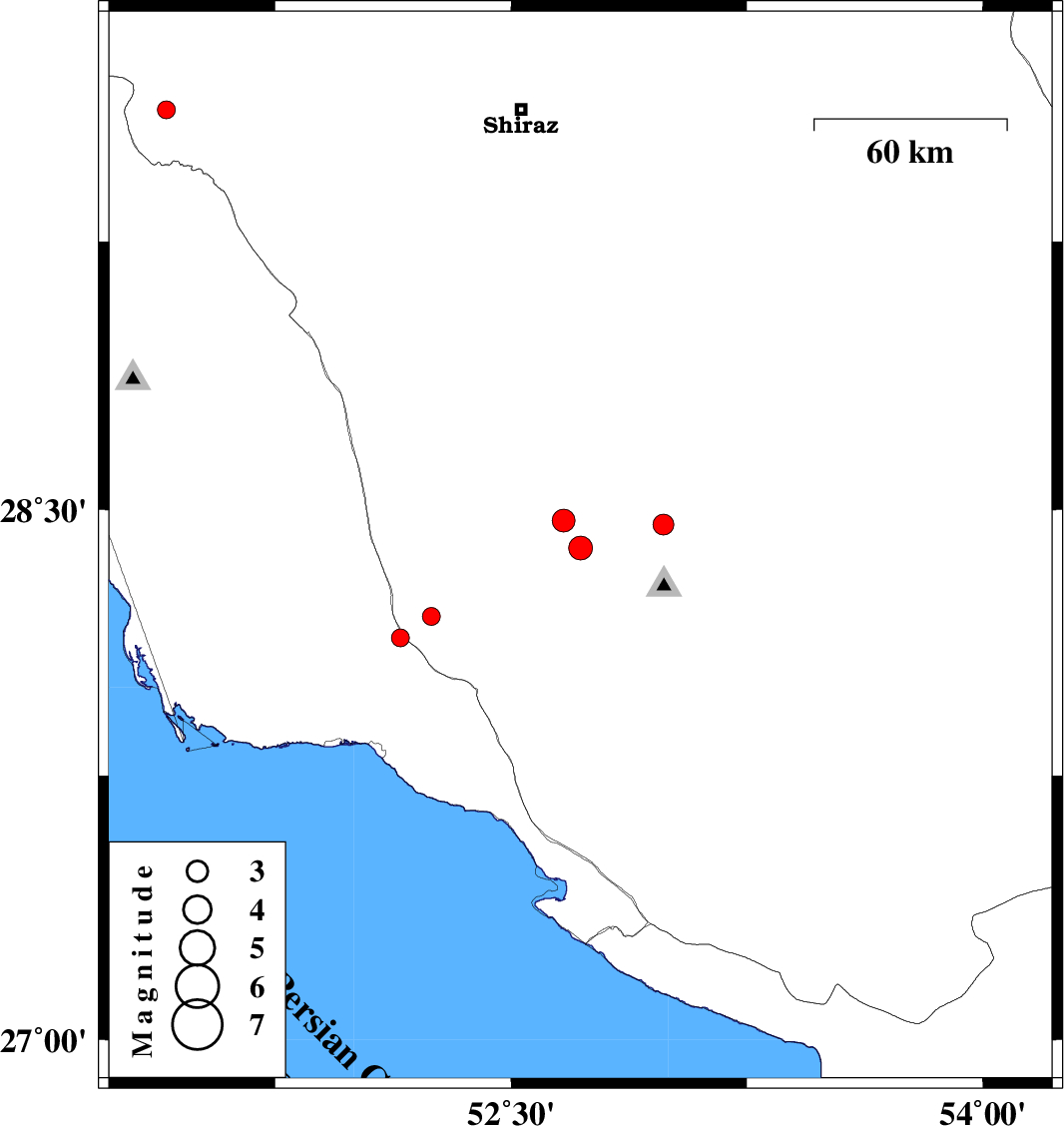 | 2017/11/01 | 07:35:34.5 | 11:05:34.5 | 28.458 | 52.984 | 14 | ML:2.9 | Fars Province, 5 km of Qir va Karzin | ||