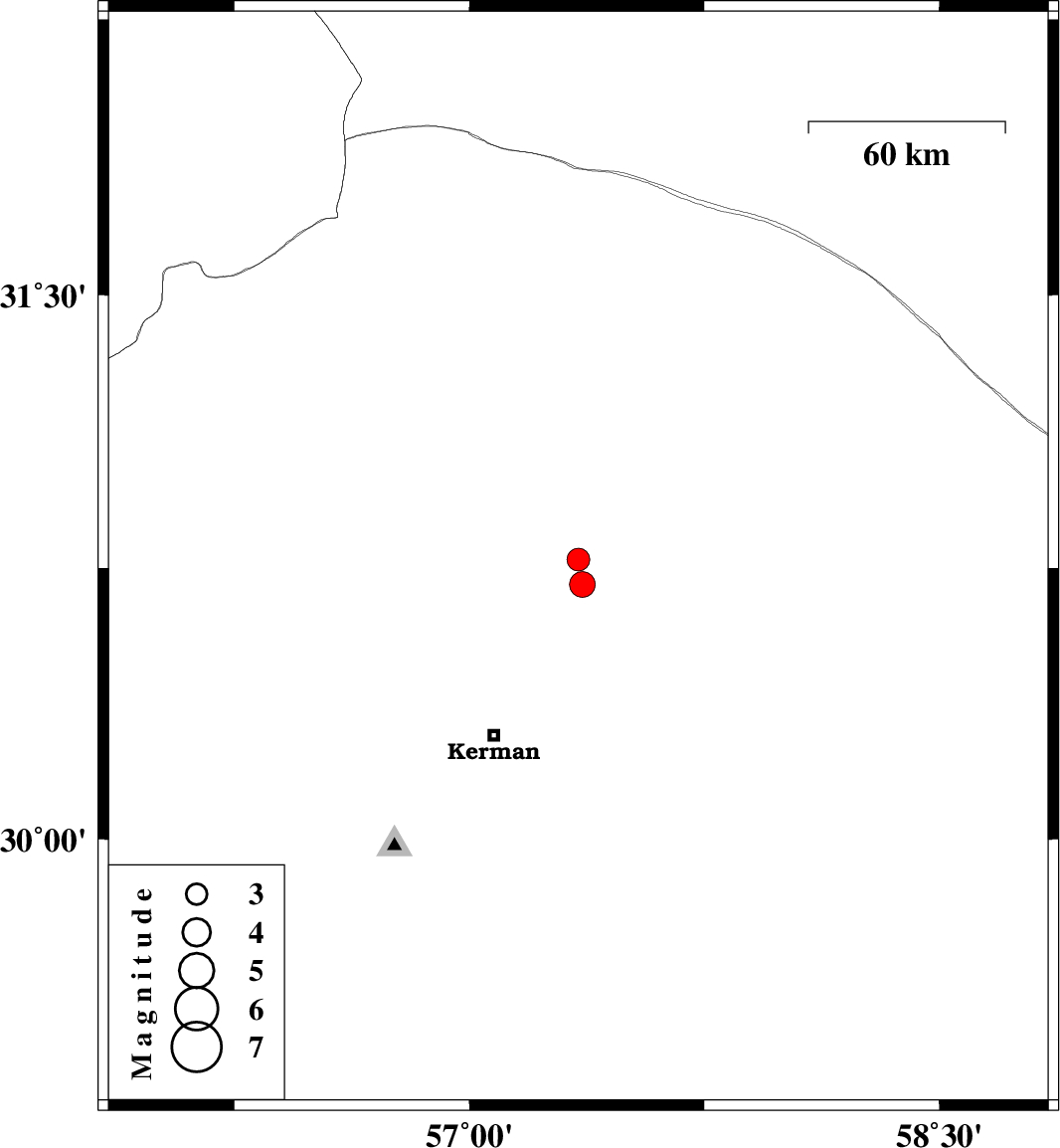 | 2017/11/03 | 19:19:54.6 | 22:49:54.6 | 30.705 | 57.361 | 18 | ML:3.7 | Kerman Province, 54 km North-East of Kerman |