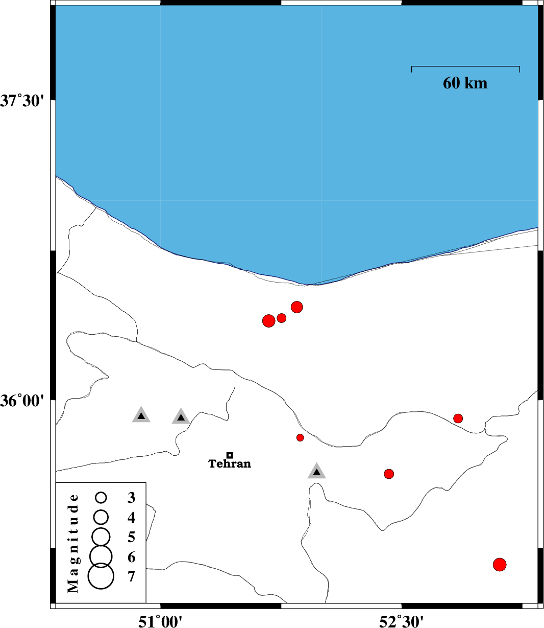 | 2017/10/14 | 02:09:25.6 | 05:39:25.6 | 35.626 | 52.421 | 24 | ML:2.7 | Tehran Province, 33 km -East of Damavand |