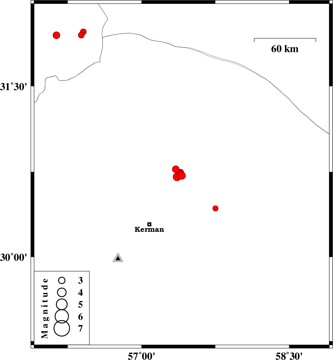 | 2017/11/03 | 19:19:54.6 | 22:49:54.6 | 30.705 | 57.361 | 18 | ML:3.7 | Kerman Province, 54 km North-East of Kerman | ||
