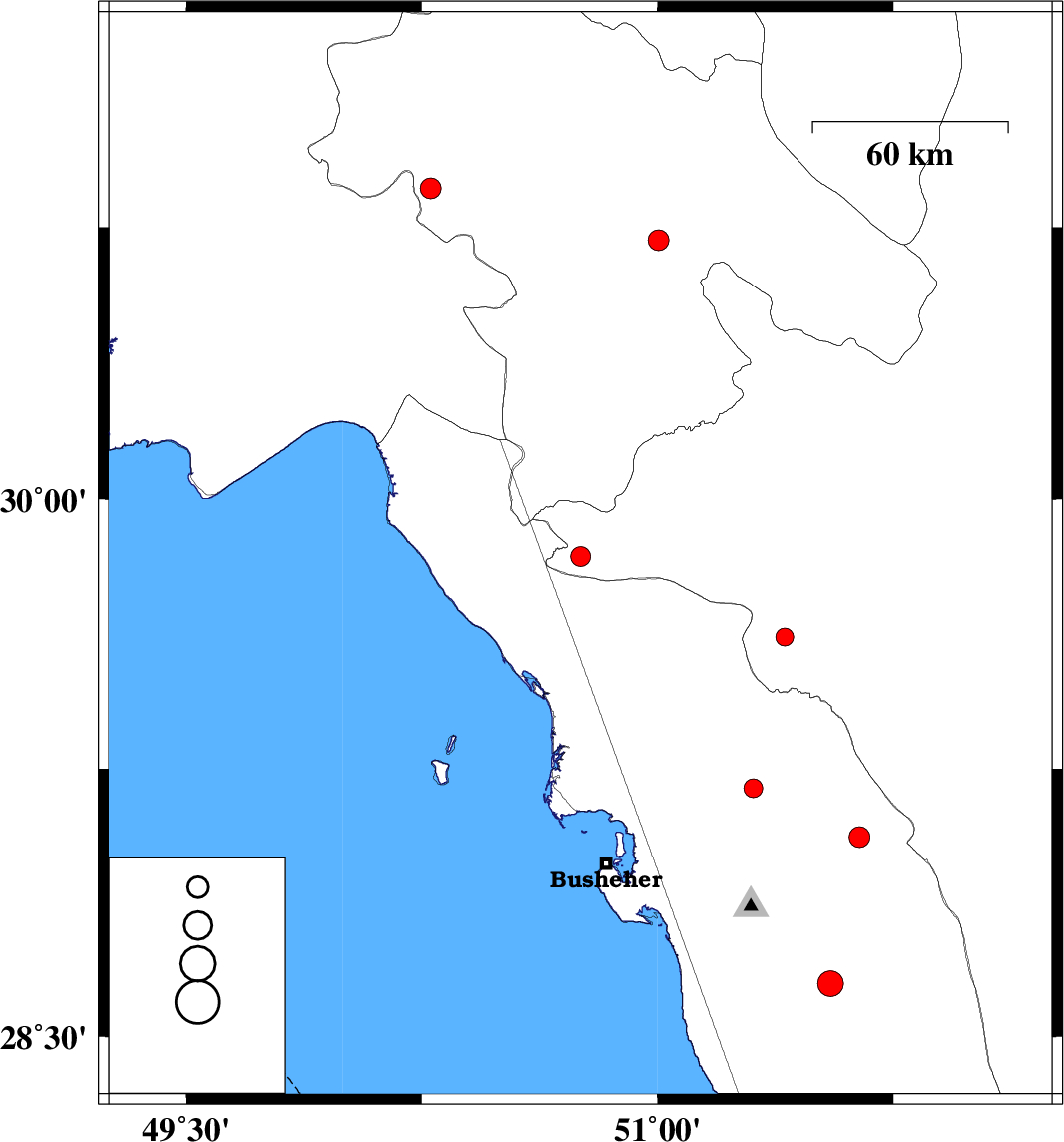 | 2017/10/16 | 09:12:52.9 | 12:42:52.9 | 29.06 | 51.642 | 14 | ML:3 | Bushehr Province, 42 km North-East of Ahram |
