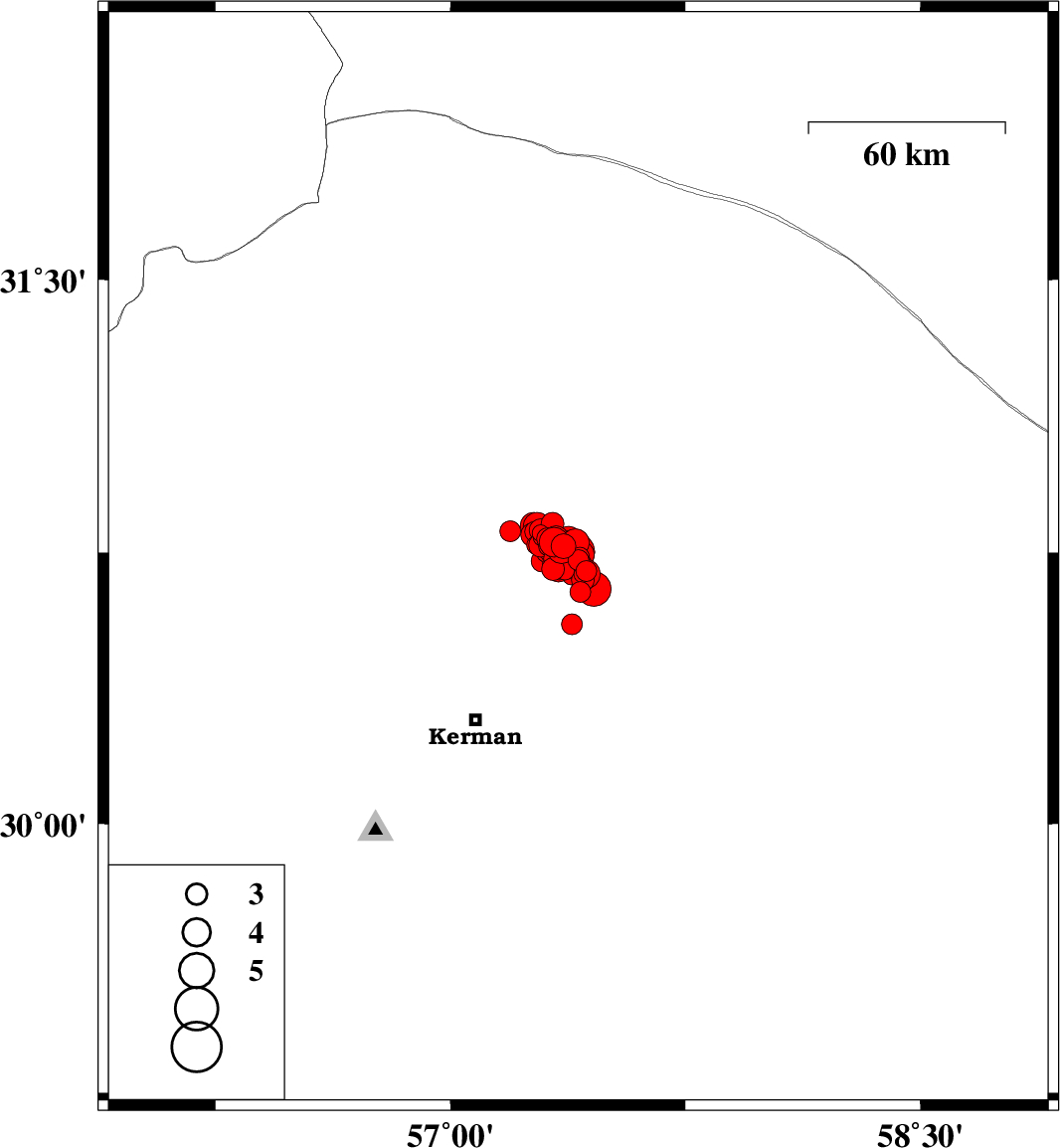 |  | 2017/12/06 | 01:29:51.4 | 04:59:51.4 | 30.777 | 57.399 | 14 | ML:4 | Kerman Province, 62 km North-East of Kerman |  |