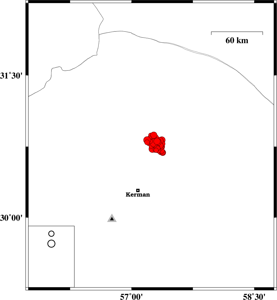 |  | 2017/12/10 | 21:06:44.6 | 00:36:44.6 | 30.785 | 57.327 | 14 | ML:2.7 | Kerman Province, 60 km North-East of Kerman |  |