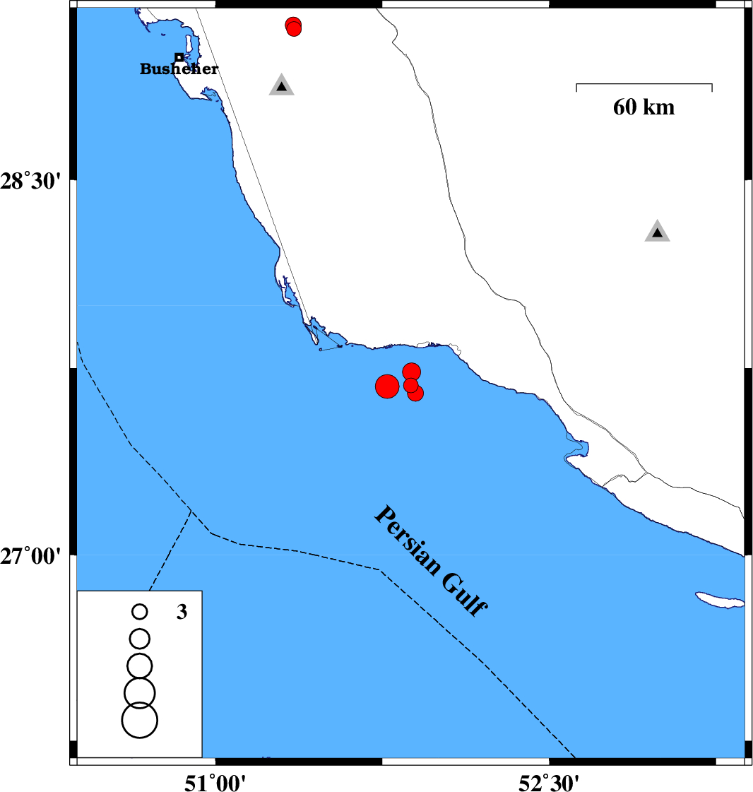 | 2017/12/27 | 00:34:04.9 | 04:04:04.9 | 27.735 | 51.882 | 17 | ML:3.6 | Persian Gulf, 20 km -West of Bandar-e kangan | ||