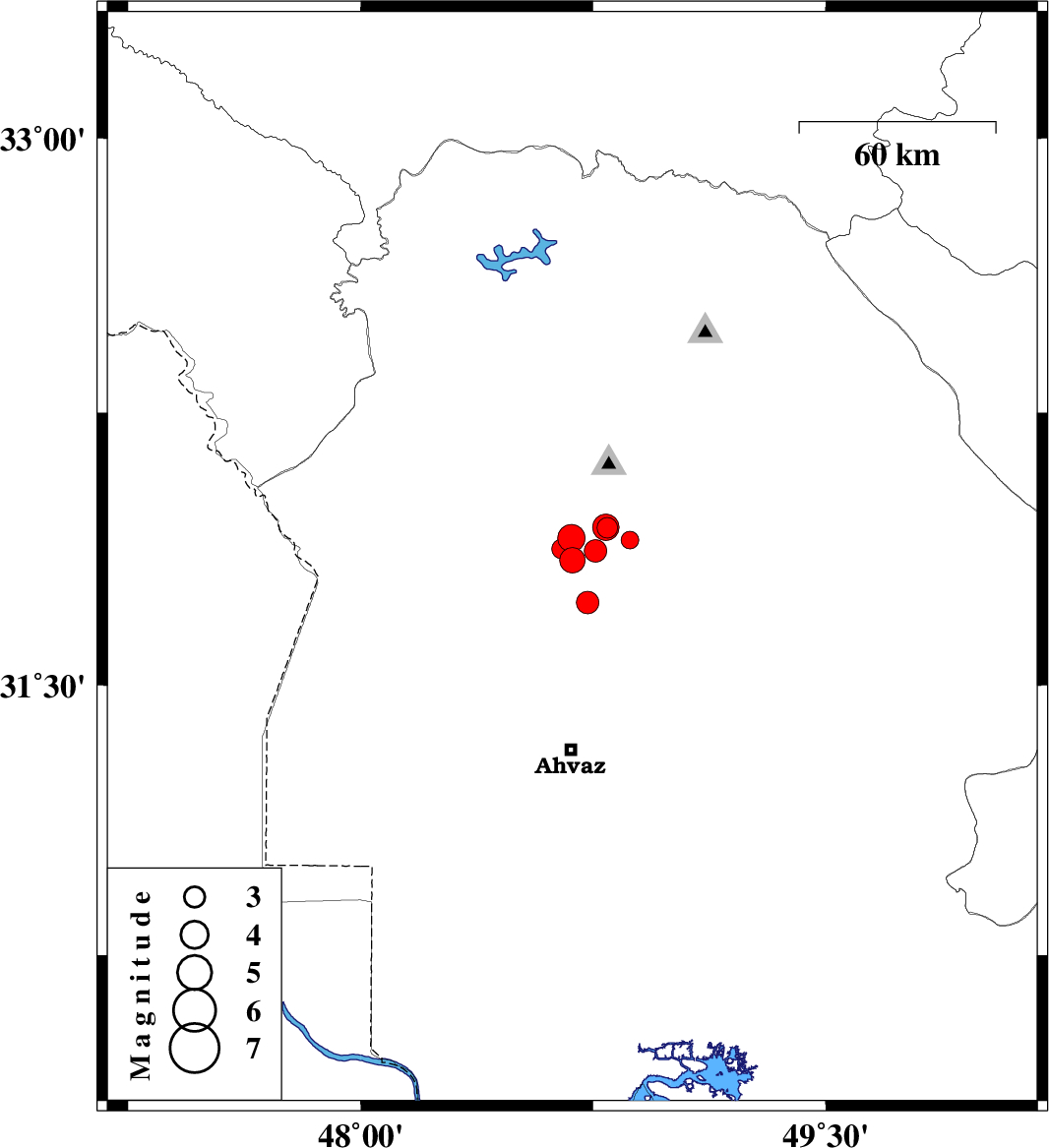 | 2017/12/30 | 07:48:20.3 | 11:18:20.3 | 31.845 | 48.683 | 15 | ML:3.7 | Khoozestan Province, 27 km South-West of Shushtar | ||
