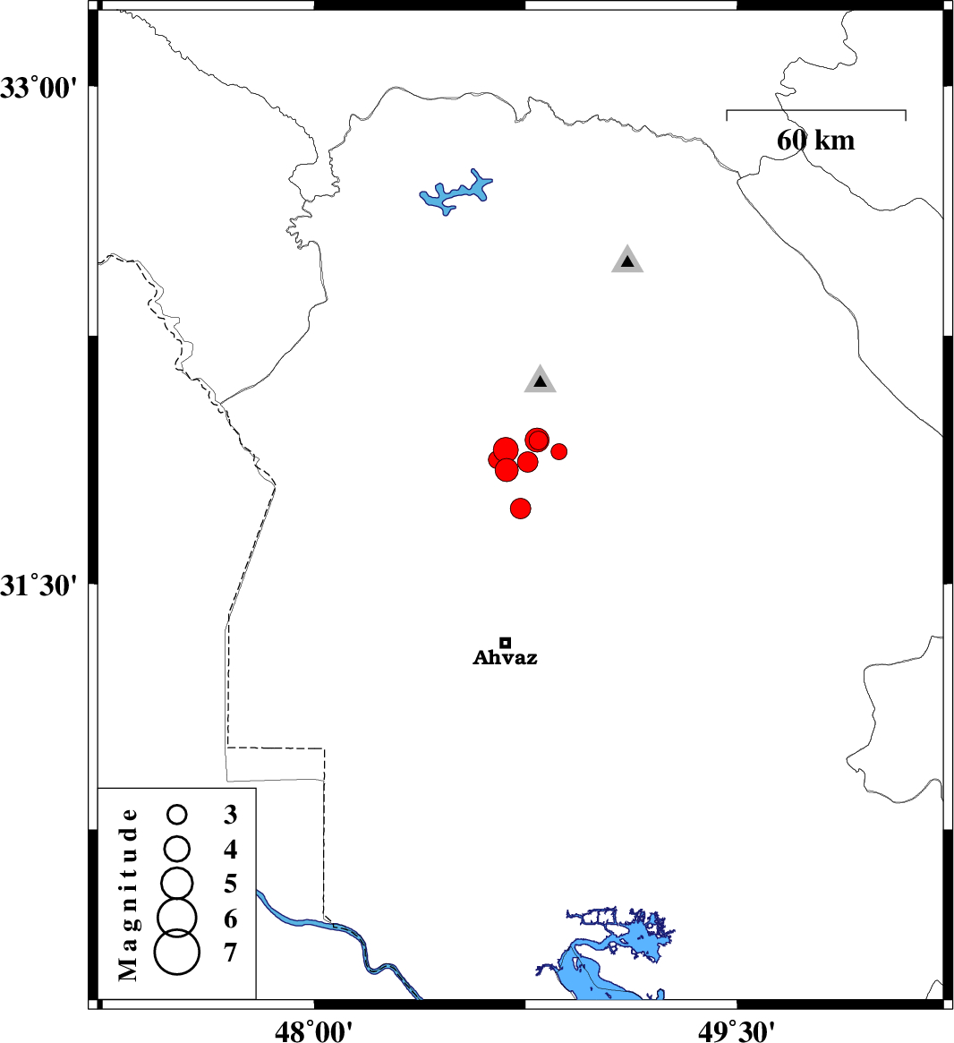 | 2017/12/30 | 07:48:20.3 | 11:18:20.3 | 31.845 | 48.683 | 15 | ML:3.7 | Khoozestan Province, 27 km South-West of Shushtar | ||
