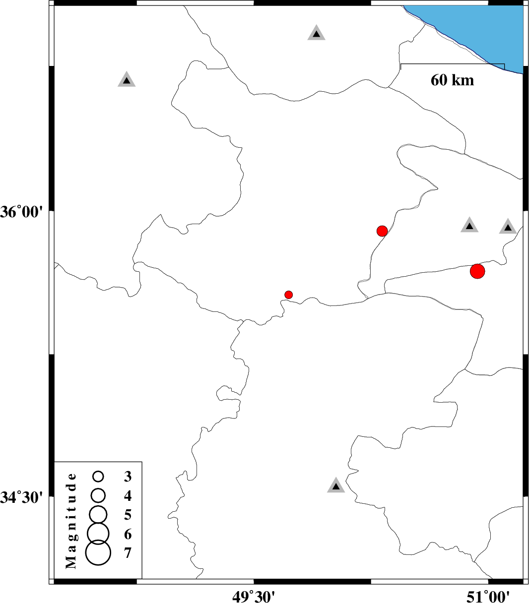 | 2018/01/02 | 22:59:29.4 | 02:29:29.4 | 35.561 | 49.722 | 14 | ML:2.3 | Ghazvin Province, 56 km South of Takestan | ||