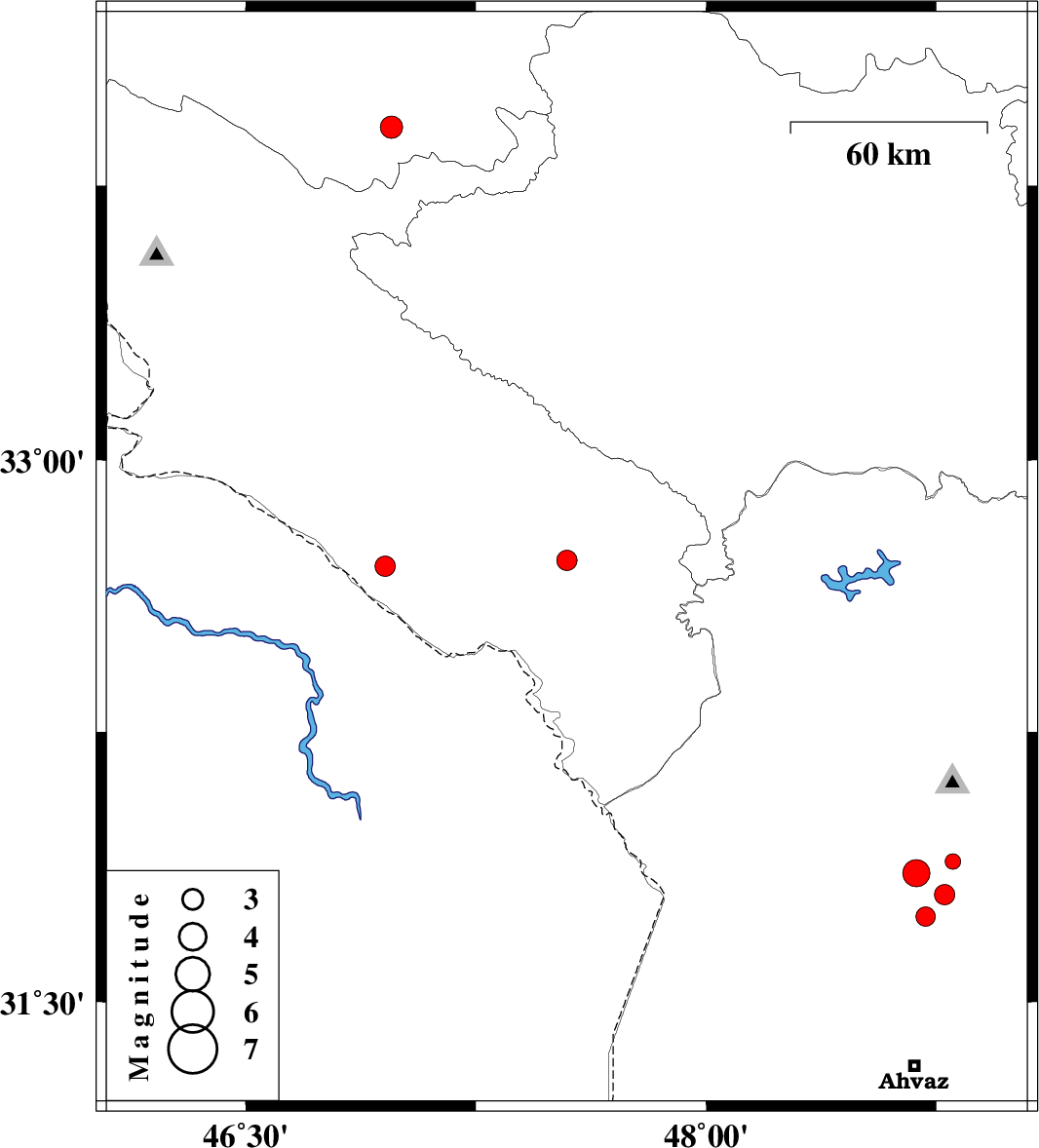 | 2018/01/07 | 22:36:24.2 | 02:06:24.2 | 31.798 | 48.777 | 15 | ML:3 | Khoozestan Province, 28 km South of Shushtar | ||