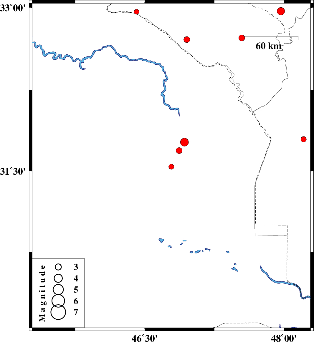 | 2018/01/15 | 22:06:37.5 | 01:36:37.5 | 31.689 | 46.871 | 14 | ML:3 | Iraq | ||