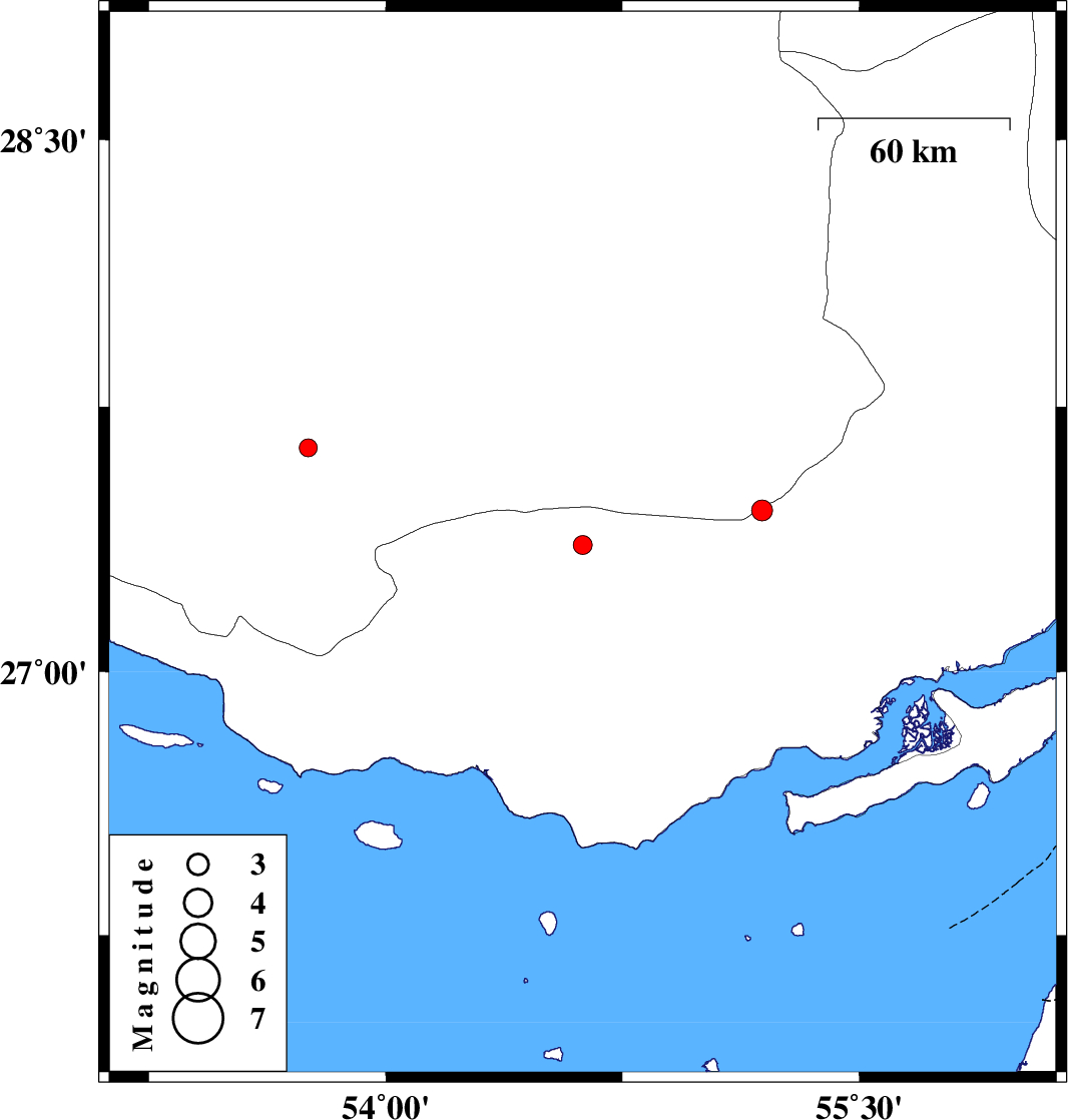 | 2018/01/13 | 01:41:30.5 | 05:11:30.5 | 27.634 | 53.755 | 14 | ML:2.5 | Fars Province, 58 km -West of Lar |