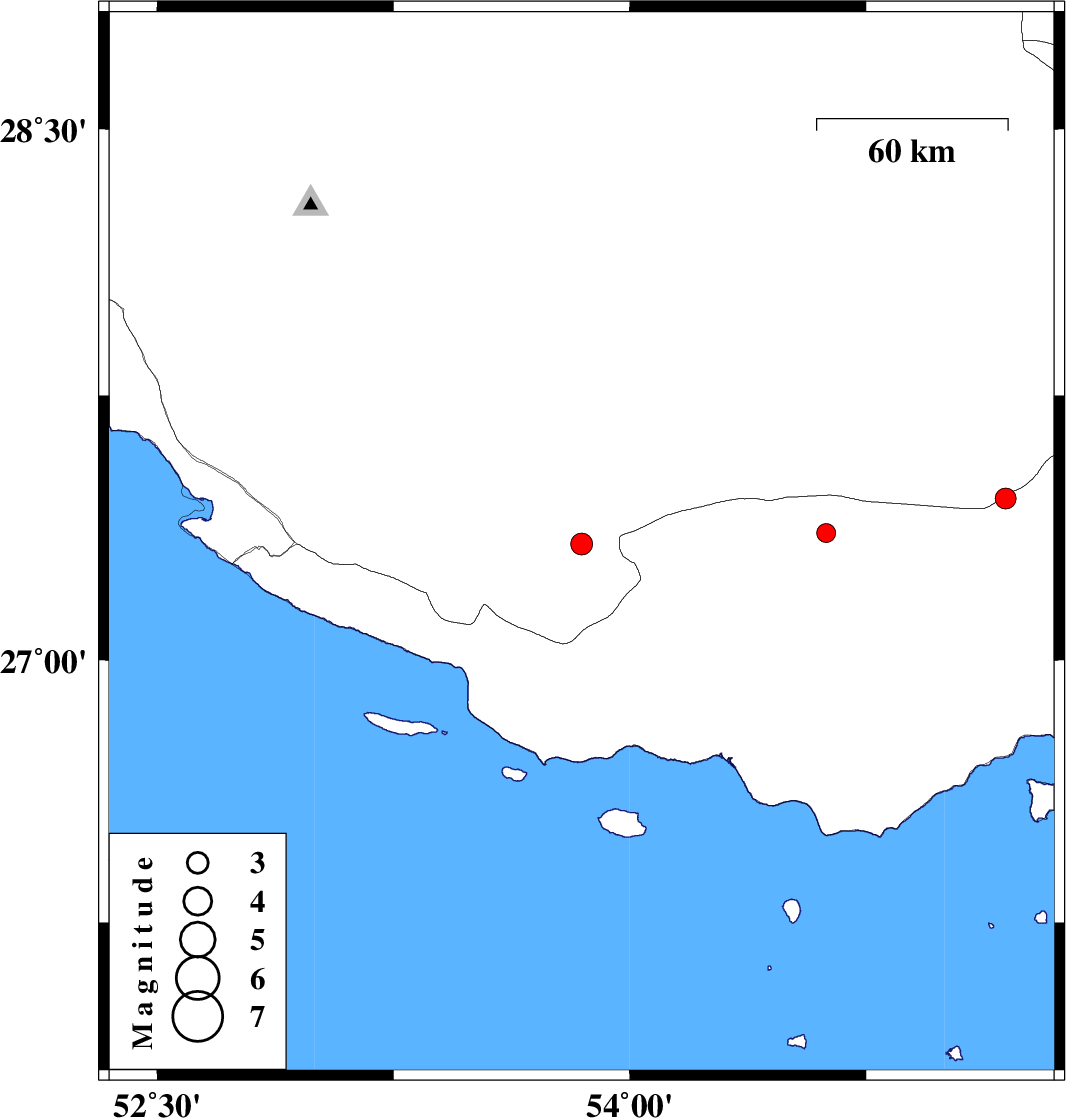 | 2018/01/21 | 04:33:39.9 | 08:03:39.9 | 27.329 | 53.847 | 18 | ML:3.1 | Fars Province, 53 km North-West of Bastak | ||