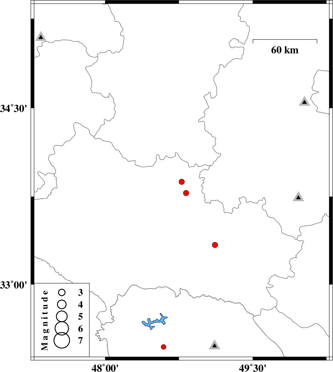| 2018/01/04 | 04:40:17.9 | 08:10:17.9 | 33.781 | 48.822 | 9 | ML:2.6 | Lorestan Province, 14 km South of Borujerd | ||