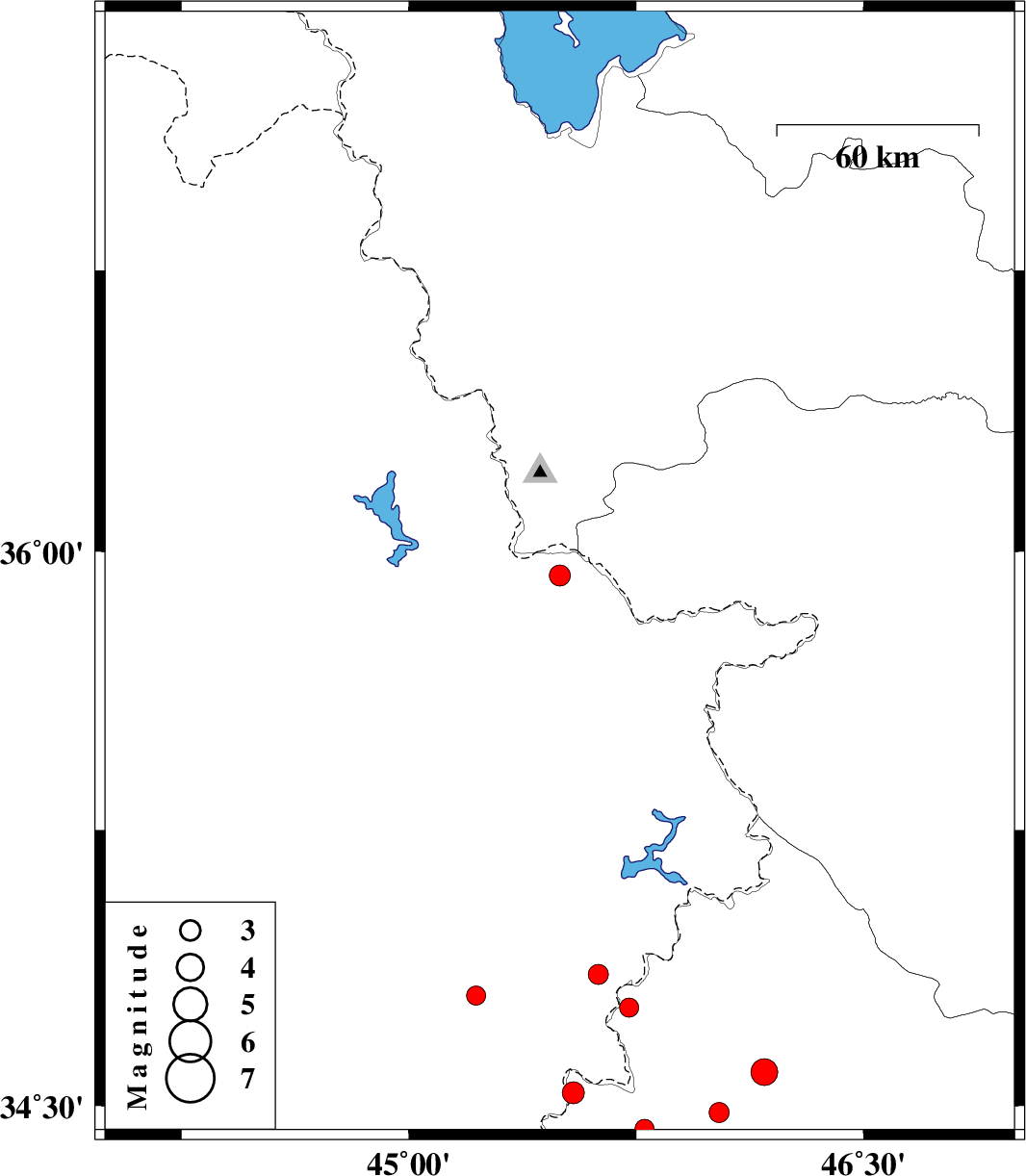 | 2018/01/25 | 03:19:14.4 | 06:49:14.4 | 34.593 | 46.173 | 15 | ML:4 | Kermanshah Province, 30 km North-East of Sar-e pol-e zahab | ||