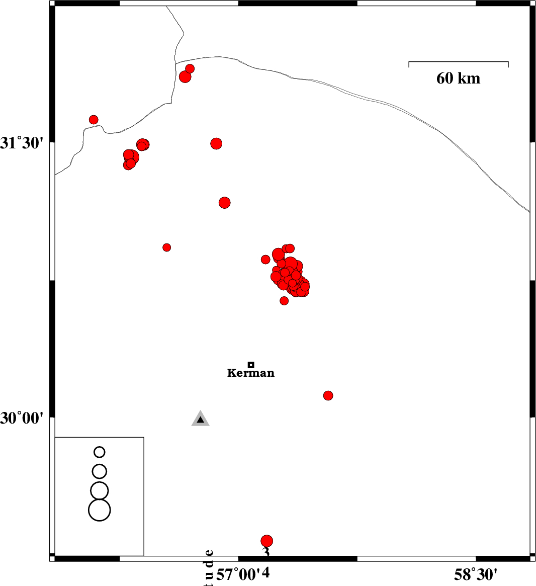 |  | 2018/01/06 | 07:20:04.2 | 10:50:04.2 | 30.692 | 57.365 | 14 | ML:3.3 | Kerman Province, 53 km North-East of Kerman |  |