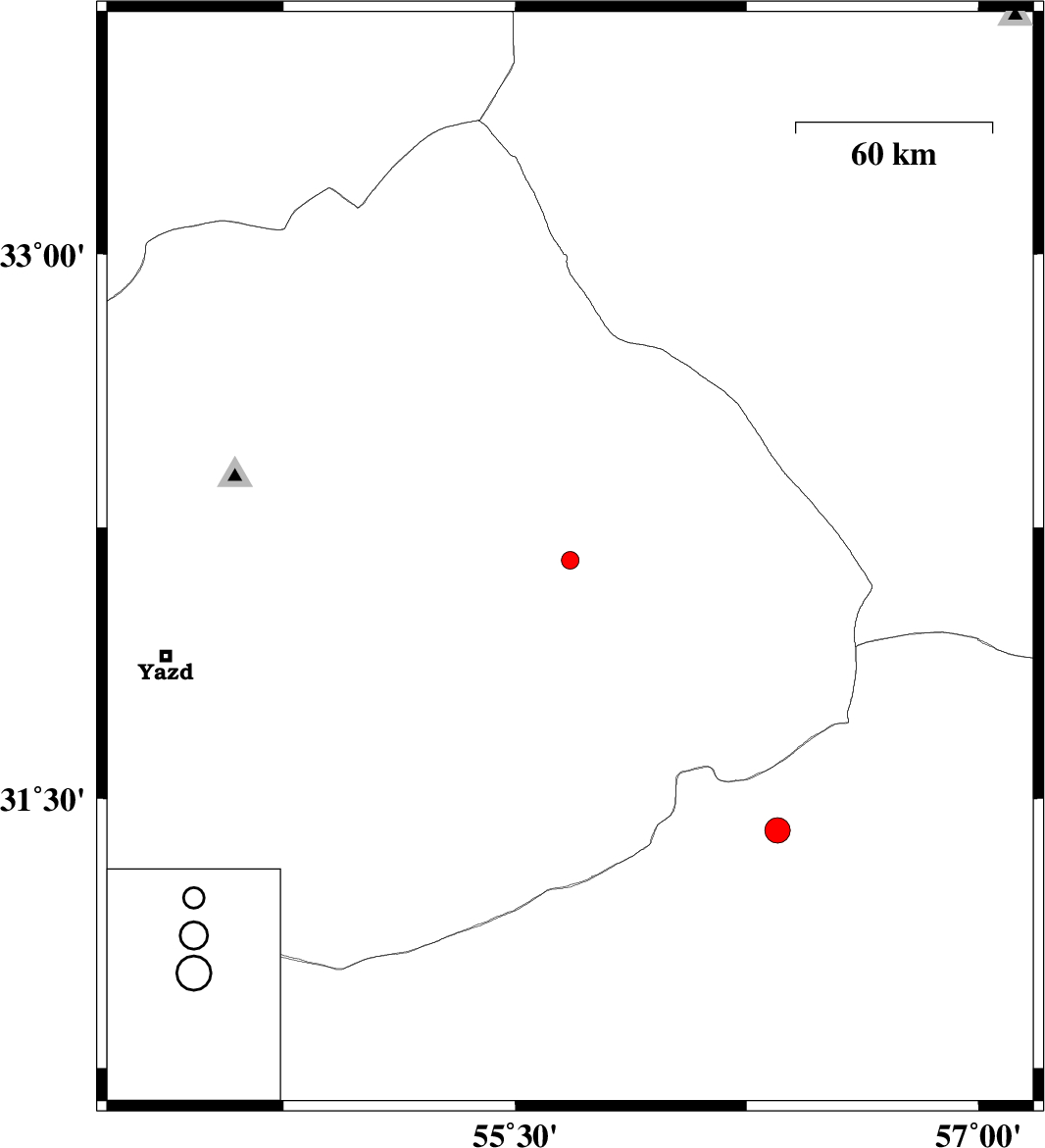 | 2018/02/06 | 05:43:05.8 | 09:13:05.8 | 31.412 | 56.35 | 14 | ML:3.6 | Kerman Province, 47 km North-West of Ravar |