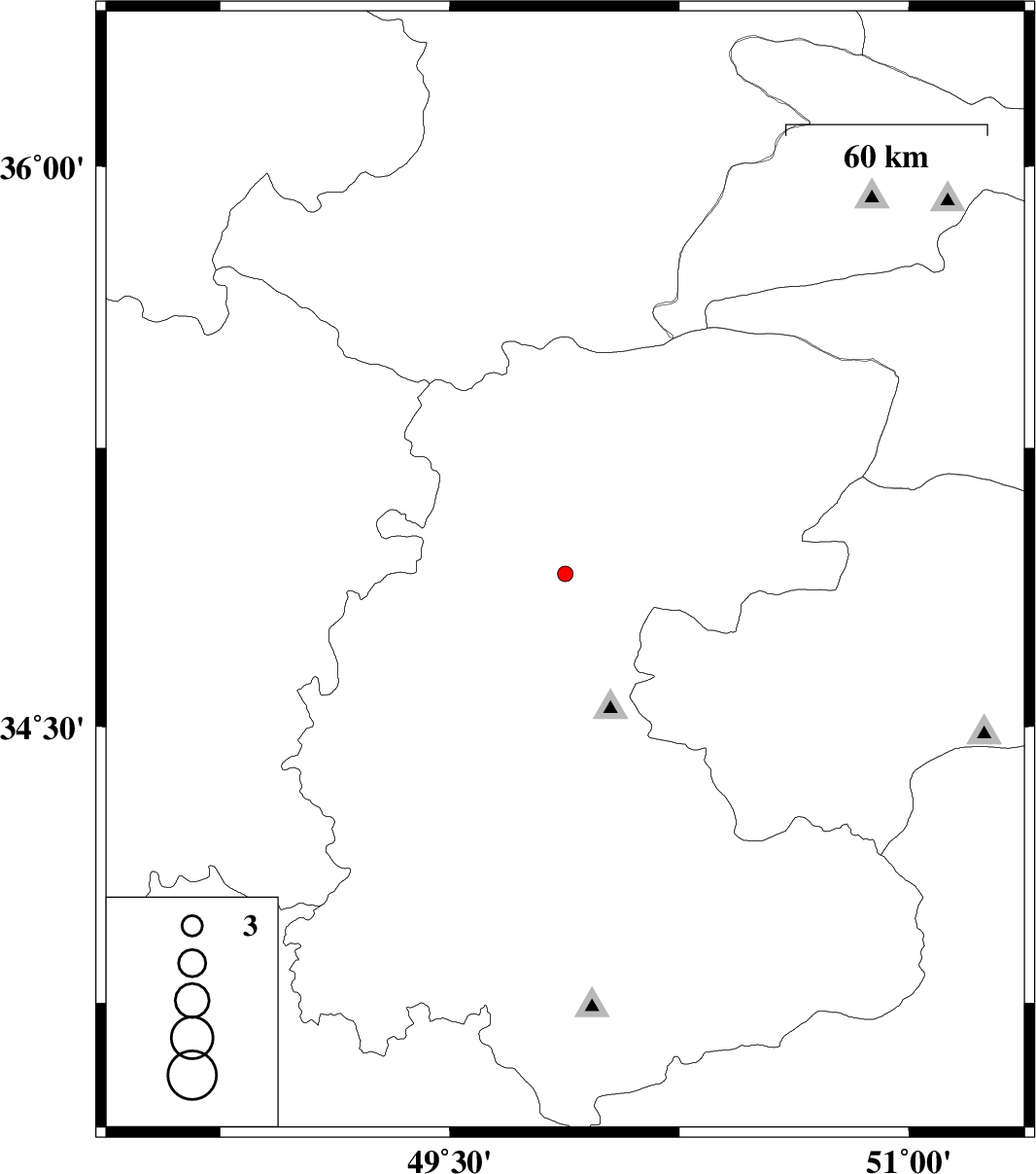 | 2018/01/30 | 19:47:04.6 | 23:17:04.6 | 34.911 | 49.877 | 6 | ML:2.2 | Markazi Province, 28 km North-West of Tafresh | ||