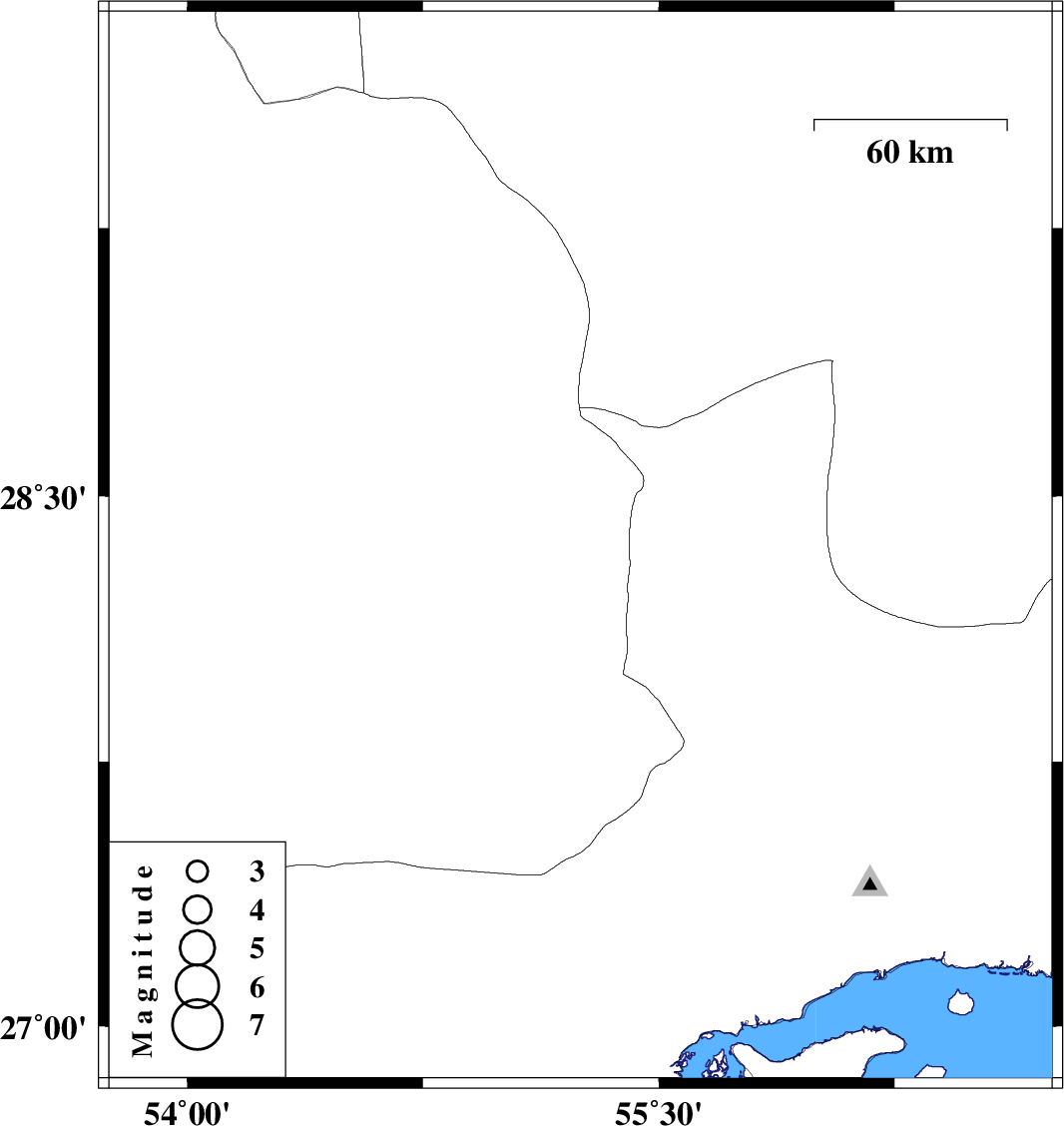 | 2018/02/15 | 19:03:30.1 | 22:33:30.1 | 28.353 | 55.251 | 6 | ML:2.4 | Fars Province, 64 km -West of Hajiabad |