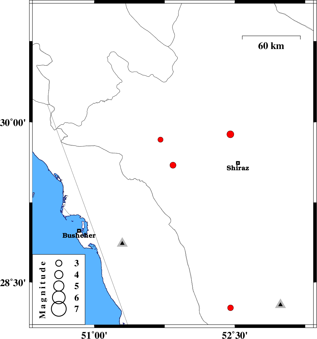 | 2018/02/18 | 02:12:07.4 | 05:42:07.4 | 29.837 | 51.706 | 6 | ML:2.6 | Fars Province, 25 km North of Kazerun |