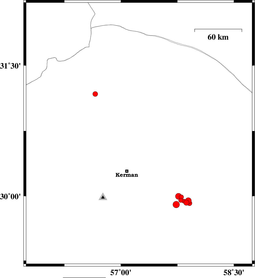 | 2018/02/16 | 10:46:26.6 | 14:16:26.6 | 30.728 | 57.419 | 15 | ML:2.9 | Kerman Province, 59 km North-East of Kerman |