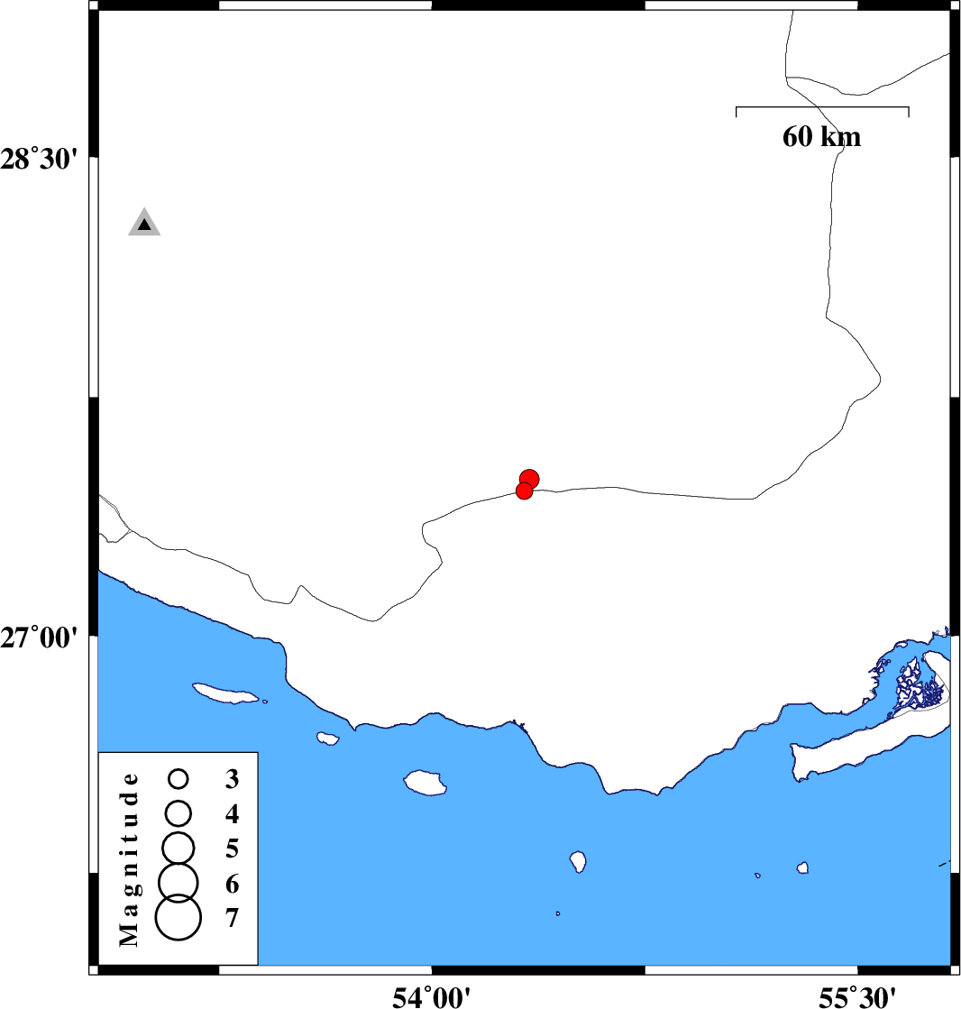 | 2018/02/26 | 15:27:38.7 | 18:57:38.7 | 27.492 | 54.342 | 15 | ML:3.1 | Fars Province, 21 km South of Lar |