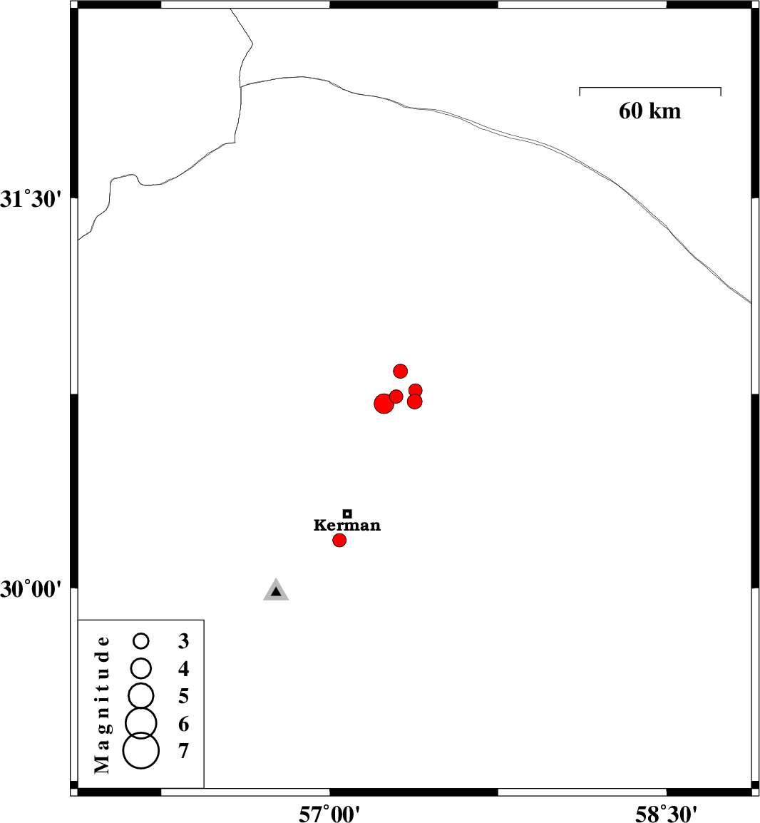 | 2018/02/27 | 01:21:25.5 | 04:51:25.5 | 30.74 | 57.296 | 16 | ML:2.7 | Kerman Province, 54 km North-East of Kerman | ||