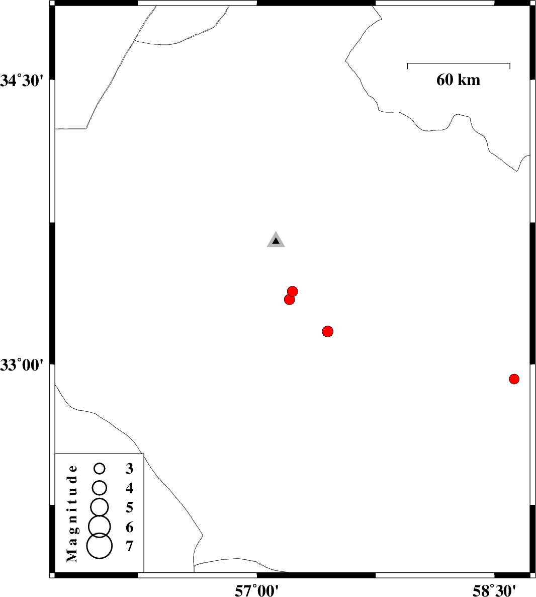 | 2018/03/11 | 01:01:19.2 | 04:31:19.2 | 33.386 | 57.224 | 8 | ML:3 | Yazd Province, 36 km South-East of Tabas | ||