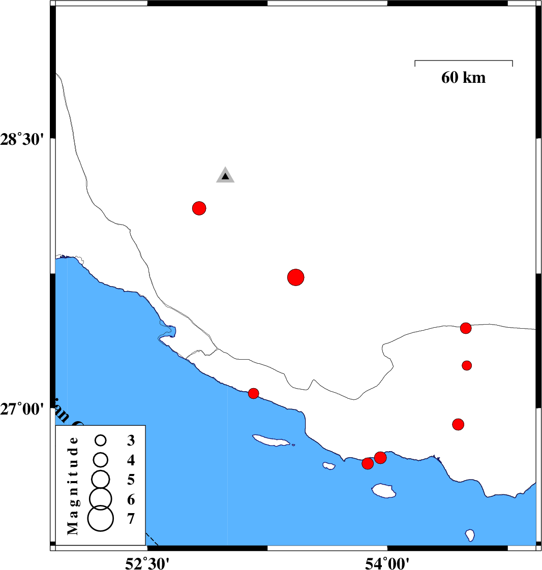 | 2018/04/21 | 20:17:58.2 | 00:47:58.2 | 27.446 | 54.488 | 15 | ML:3.1 | Hormozgan Province, 30 km North-East of Bastak | ||