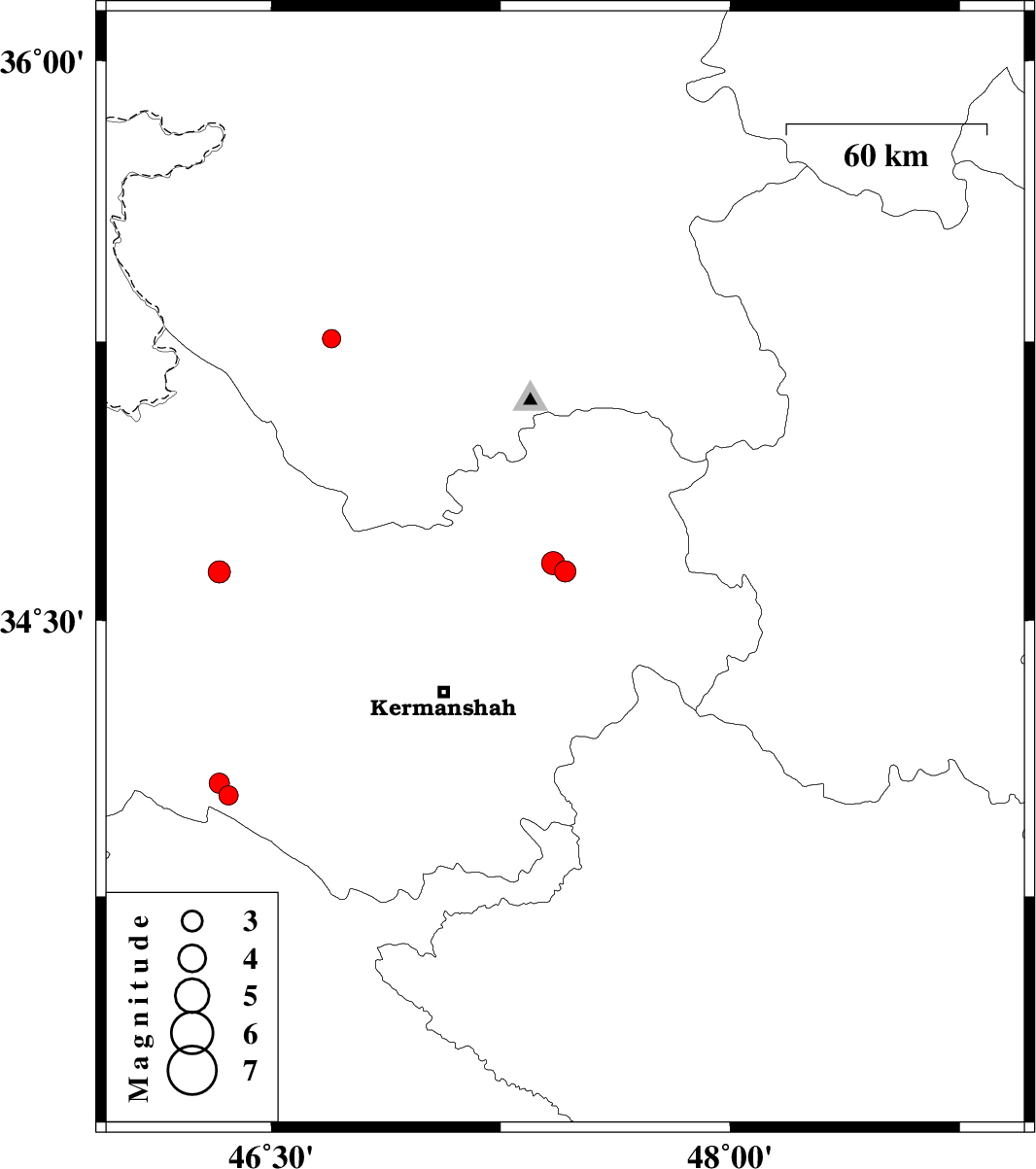 | 2018/05/04 | 11:46:24.9 | 16:16:24.9 | 34.655 | 47.422 | 6 | ML:3.4 | Kermanshah Province, 21 km South-West of Sonqor | ||