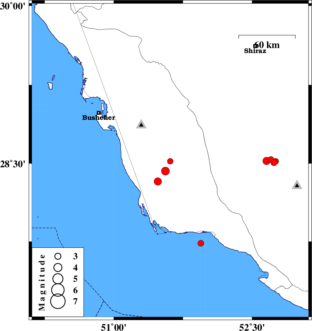 | 2018/04/28 | 12:18:39.6 | 16:48:39.6 | 28.328 | 51.478 | 15 | ML:3.7 | Bushehr Province, 37 km South-East of Khormog |