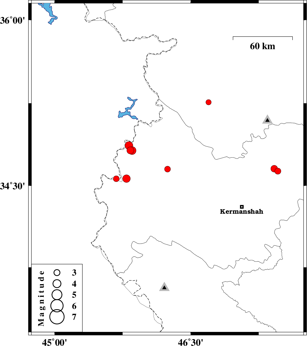 | 2018/04/30 | 22:13:37.9 | 02:43:37.9 | 34.866 | 45.819 | 15 | ML:4 | Kermanshah Province, 12 km North of Tazehabad |