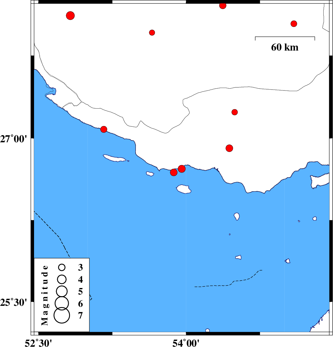 | 2018/04/19 | 23:02:18.2 | 03:32:18.2 | 26.688 | 53.875 | 14 | ML:3.2 | Persian Gulf, 75 km South-West of Bastak | ||