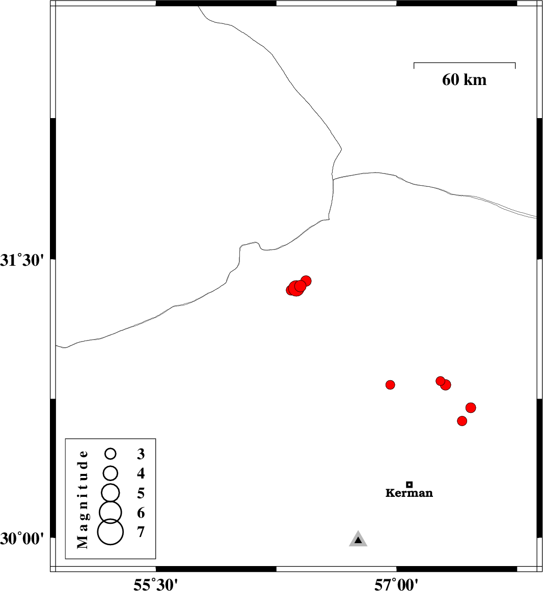 | 2018/04/19 | 05:45:23.9 | 10:15:23.9 | 30.786 | 57.244 | 14 | ML:2.9 | Kerman Province, 58 km North-East of Kerman | ||