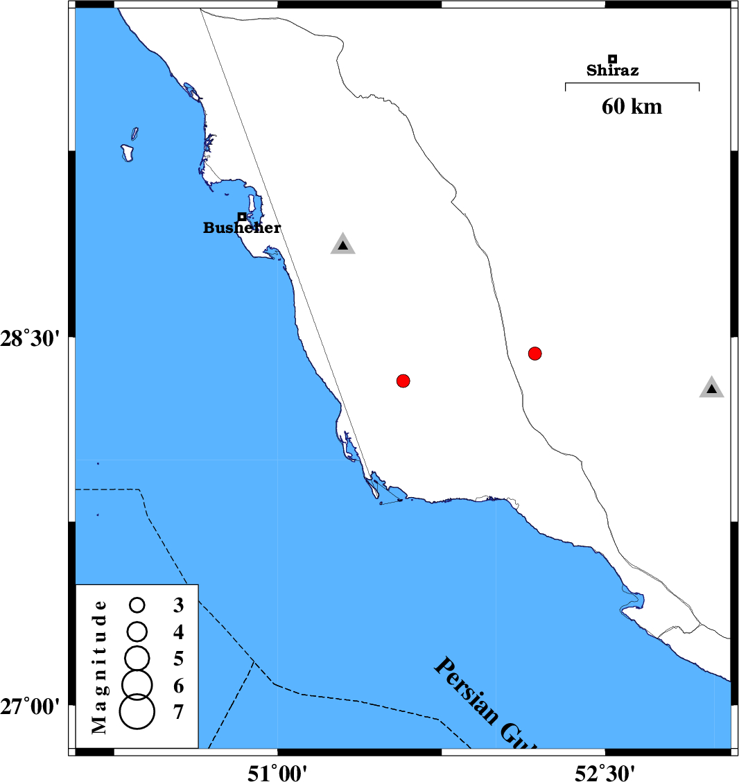 | 2018/05/16 | 15:10:09.3 | 19:40:09.3 | 28.433 | 52.177 | 6 | ML:2.7 | Fars Province, 50 km South of Farashband |
