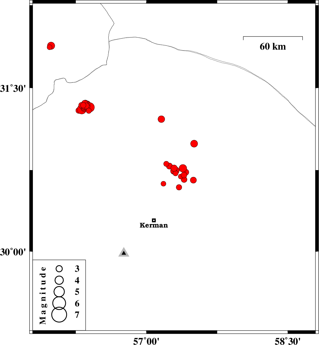 2018/05/02 | 18:13:12.9 | 22:43:12.9 | 30.743 | 57.288 | 14 | ML:3 | Kerman Province, 54 km North-East of Kerman | ||