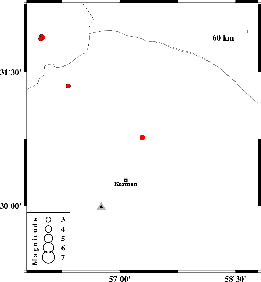 | 2018/05/16 | 19:35:38.5 | 00:05:38.5 | 30.767 | 57.293 | 14 | ML:3.1 | Kerman Province, 57 km North-East of Kerman | ||