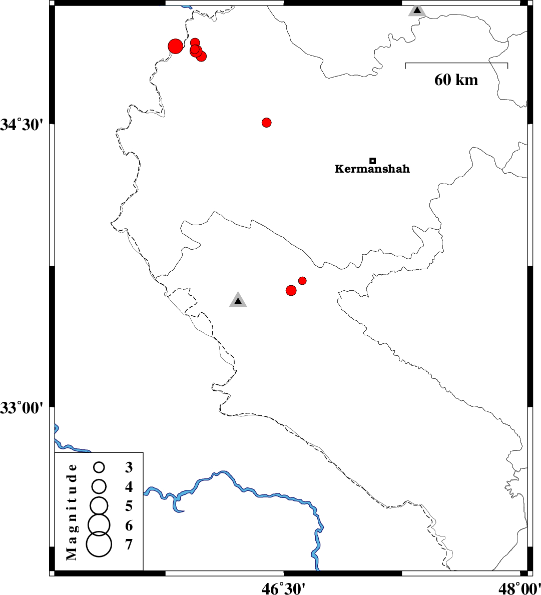 | 2018/05/24 | 08:56:29.2 | 13:26:29.2 | 33.62 | 46.546 | 14 | ML:2.9 | Ilam Province, 11 km -East of Ilam | ||