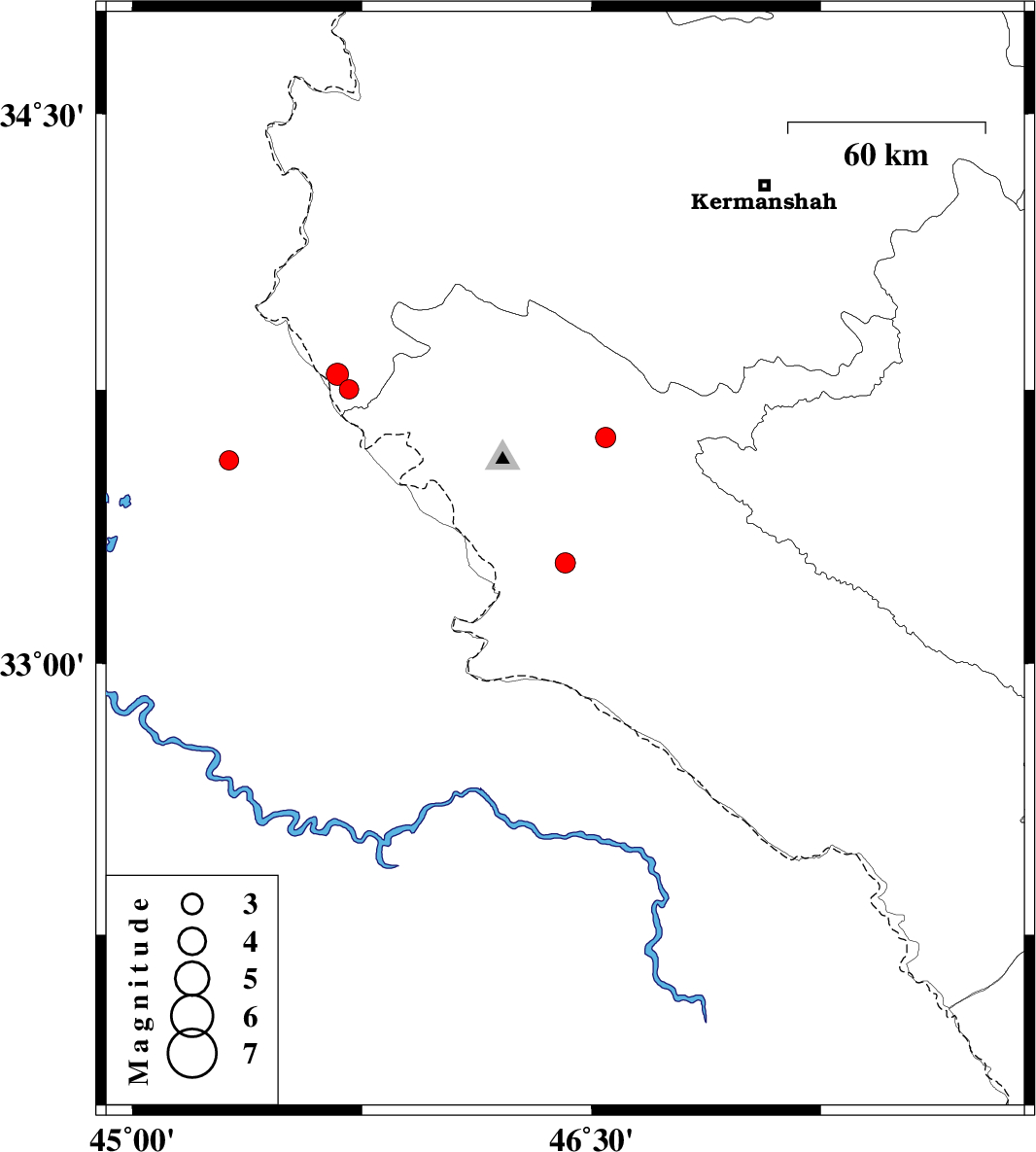 | 2018/05/26 | 04:50:52.7 | 09:20:52.7 | 33.751 | 45.708 | 14 | ML:2.8 | Kermanshah Province, 48 km South-West of Gilan-E-Gharb | ||