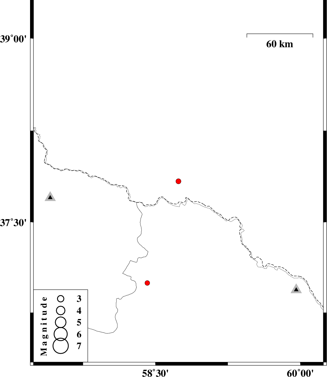 | 2018/06/01 | 18:40:45.4 | 23:10:45.4 | 36.996 | 58.416 | 14 | ML:2.2 | Khorasan(center) Province, 15 km South of Quchan |