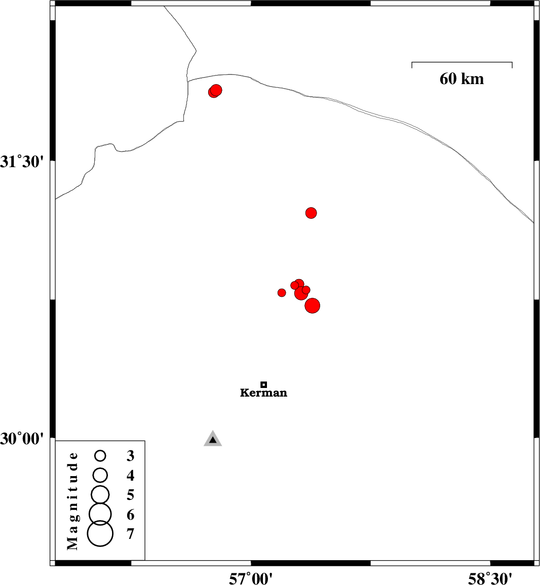 | 2018/03/30 | 23:08:00.6 | 03:38:00.6 | 30.784 | 57.314 | 15 | ML:3.8 | Kerman Province, 60 km North-East of Kerman | ||