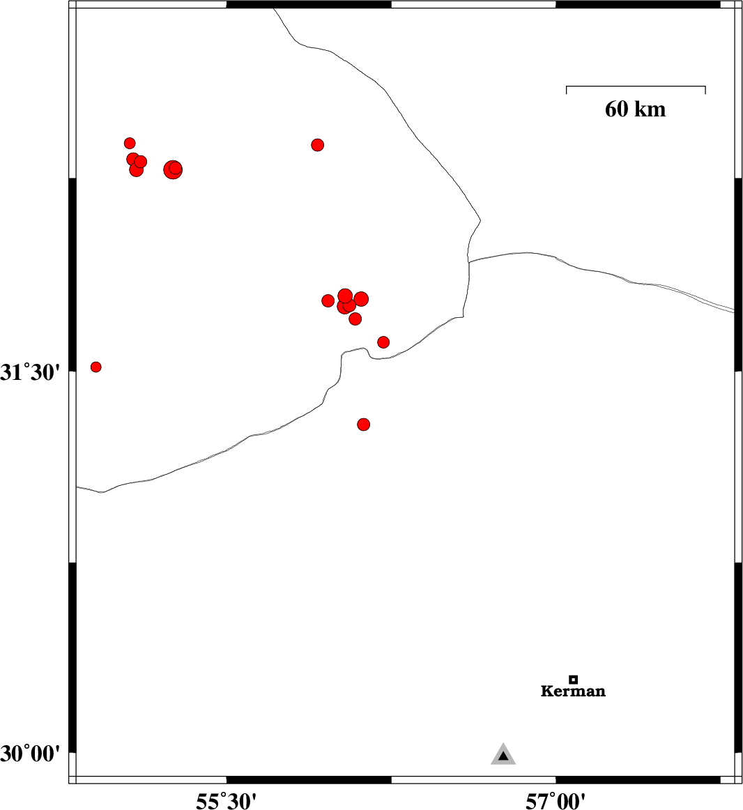 2018/06/11 | 09:58:01.1 | 14:28:01.1 | 30.626 | 57.469 | 14 | ML:2.4 | Kerman Province, 53 km North-East of Kerman | ||