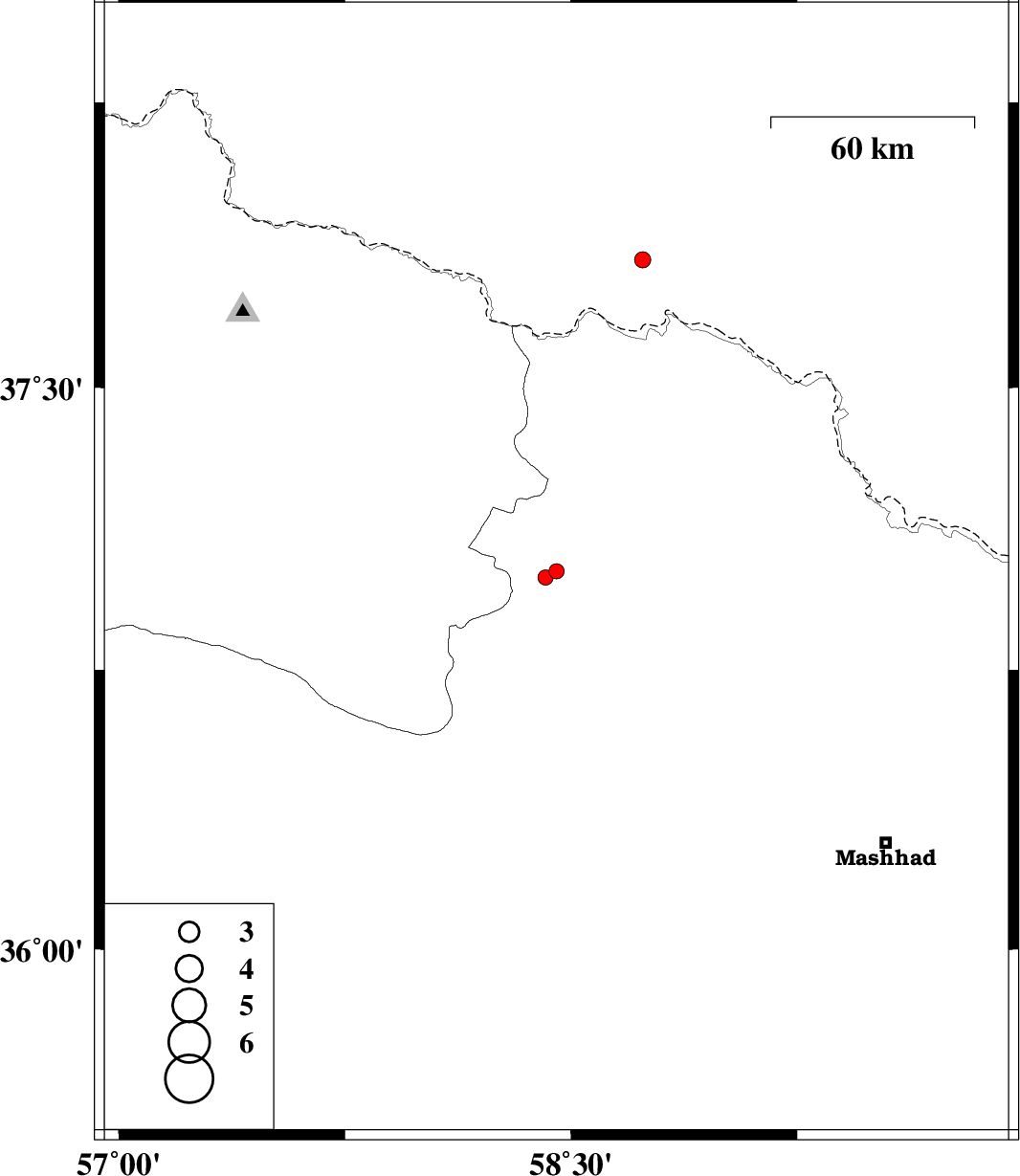 | 2018/06/12 | 05:21:23.6 | 09:51:23.6 | 37.012 | 58.452 | 14 | ML:2.3 | Khorasan(center) Province, 12 km of Quchan | ||