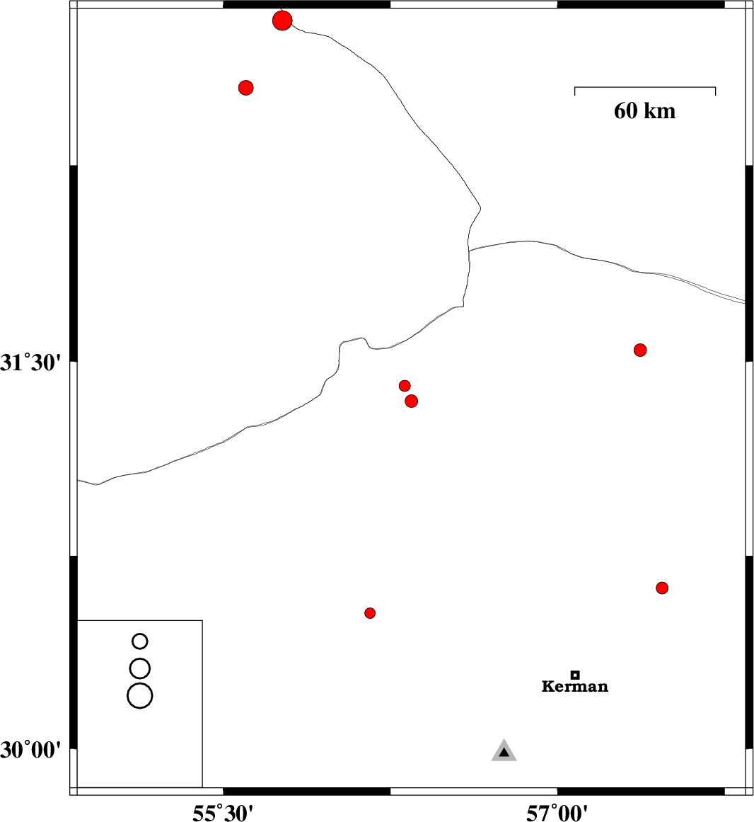 | 2018/06/11 | 09:58:01.1 | 14:28:01.1 | 30.626 | 57.469 | 14 | ML:2.4 | Kerman Province, 53 km North-East of Kerman | ||