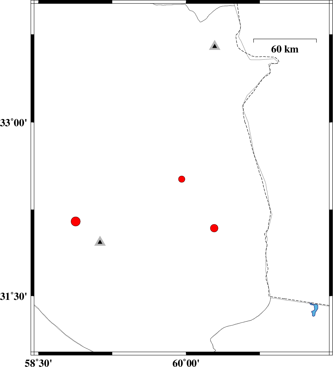| 2018/05/17 | 19:46:47.3 | 00:16:47.3 | 32.147 | 58.878 | 14 | ML:4.2 | Khorasan(south) Province, 90 km South-West of Birjand |