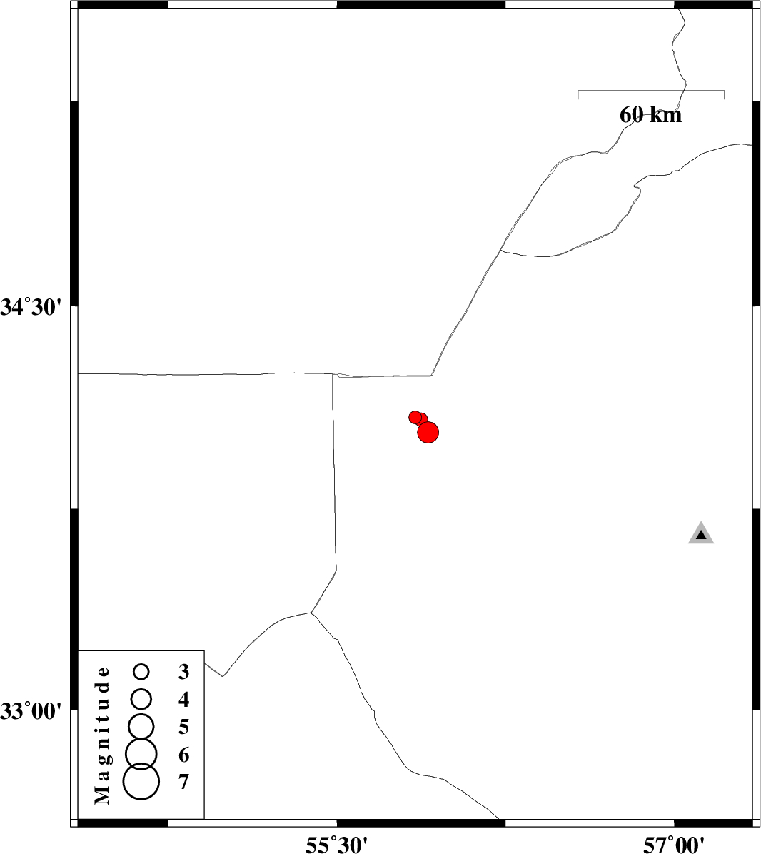 | 2018/06/21 | 07:19:01.8 | 11:49:01.8 | 34.034 | 55.905 | 15 | ML:4.2 | Yazd Province, 106 km North-West of Tabas | ||