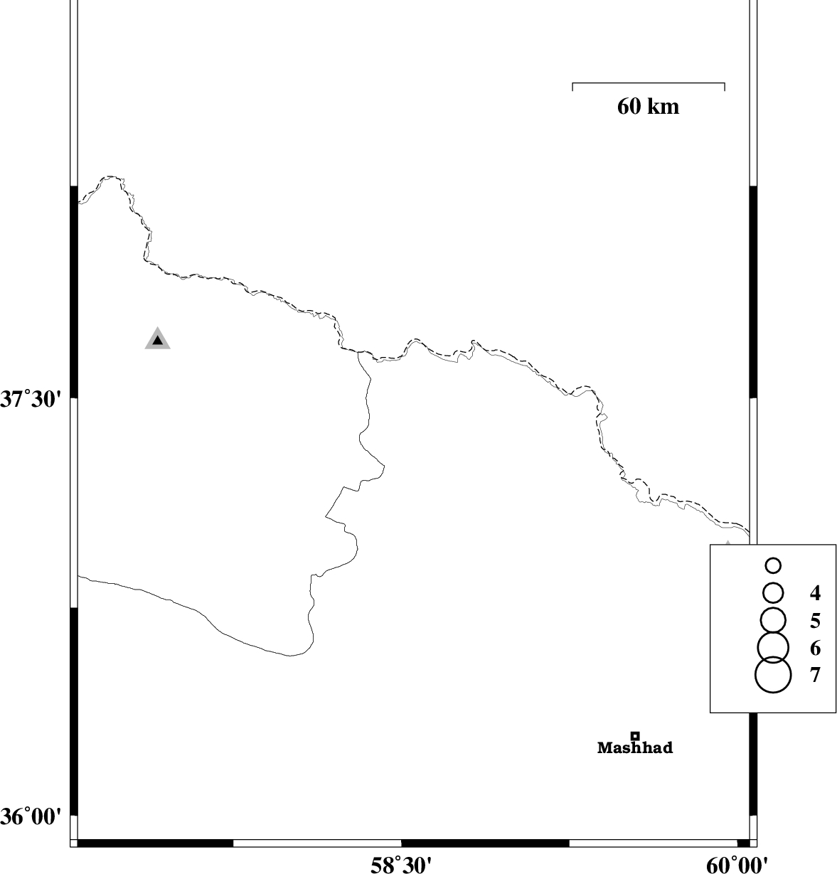 | 2018/06/12 | 05:21:23.6 | 09:51:23.6 | 37.012 | 58.452 | 14 | ML:2.3 | Khorasan(center) Province, 12 km of Quchan | ||