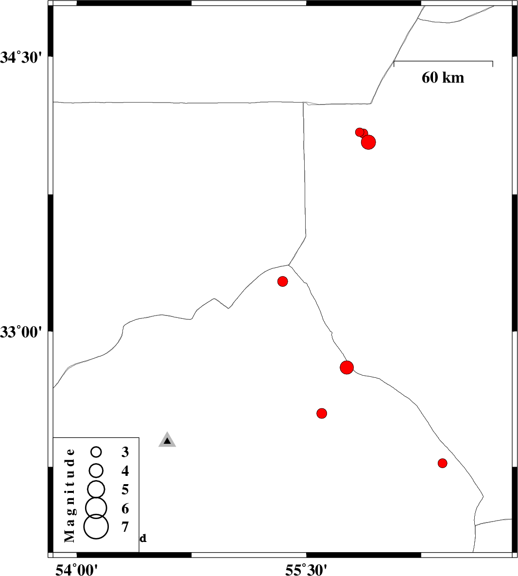 | 2018/06/06 | 10:40:37.5 | 15:10:37.5 | 32.8 | 55.765 | 17 | ML:3.9 | Yazd Province, 138 km North-East of Bafq |