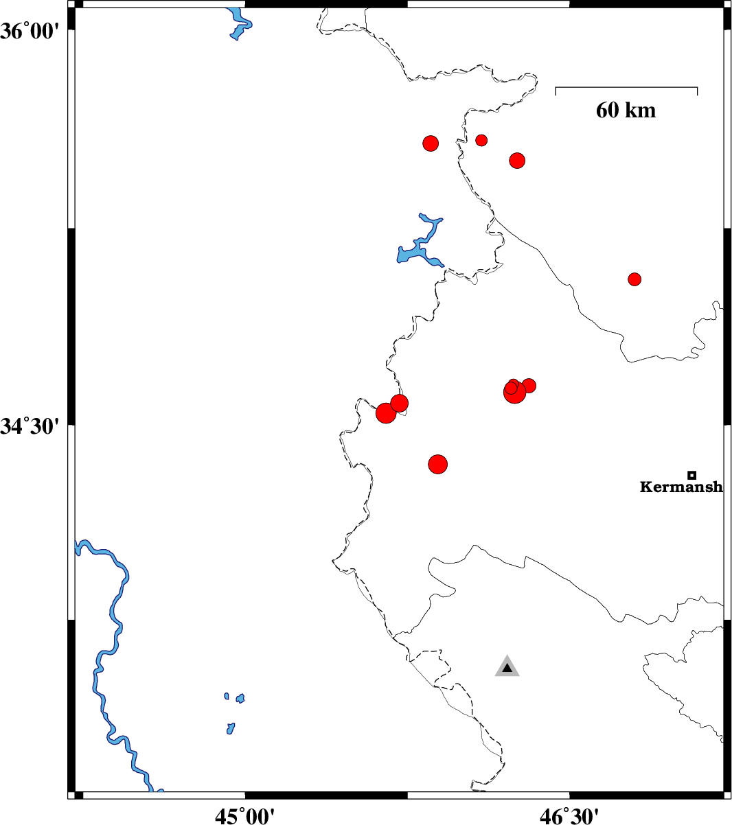 2018/06/26 | 22:35:44.9 | 03:05:44.9 | 34.656 | 46.239 | 6 | ML:2.1 | Kermanshah Province, 27 km South-West of Javanrud | ||