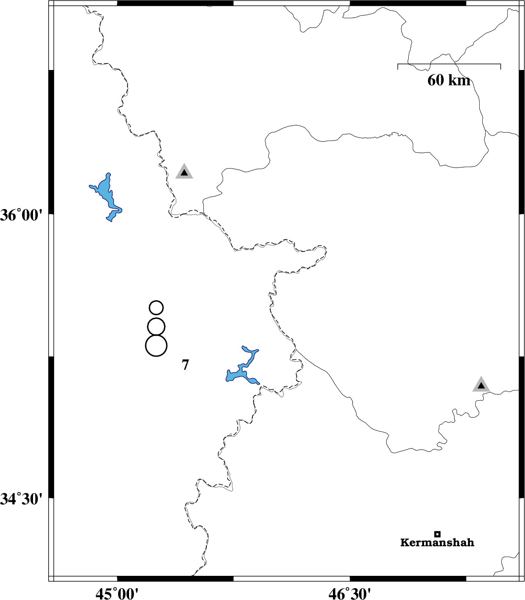 2018/06/25 | 18:22:10.0 | 22:52:10.0 | 35.582 | 46.091 | 15 | ML:2.4 | Kurdistan Province, 9 km of Marivan | ||