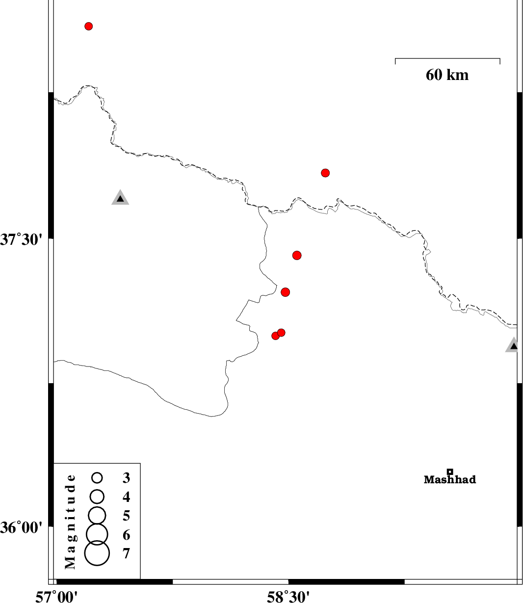 | 2018/06/26 | 01:16:42.7 | 05:46:42.7 | 37.412 | 58.554 | 14 | ML:2.5 | Khorasan(center) Province, 34 km North of Quchan | ||