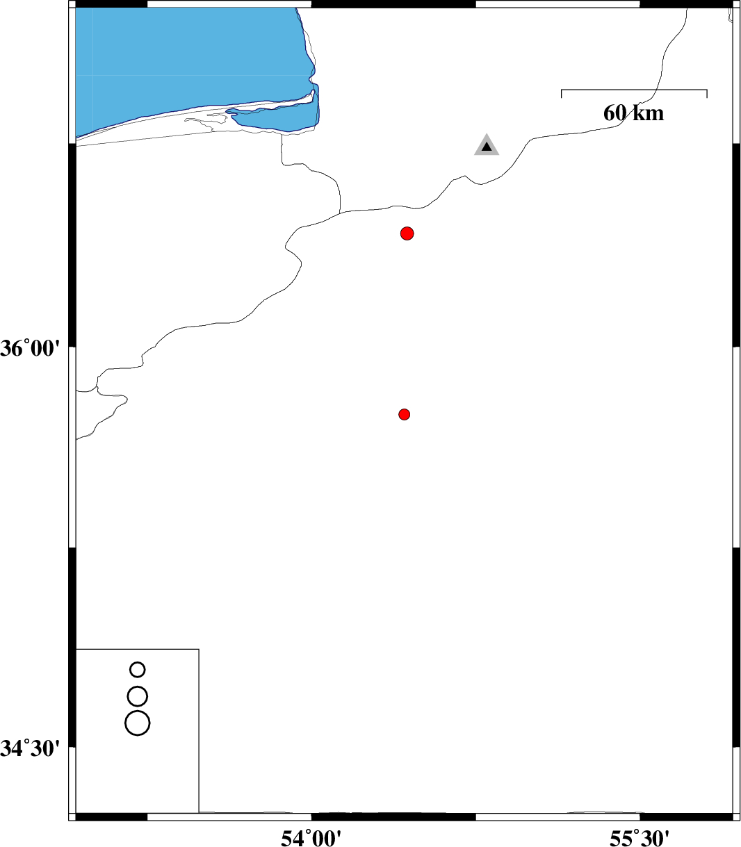 | 2018/06/25 | 00:58:05.1 | 05:28:05.1 | 36.419 | 54.436 | 17 | ML:2.7 | Semnan Province, 29 km North of Damghan |